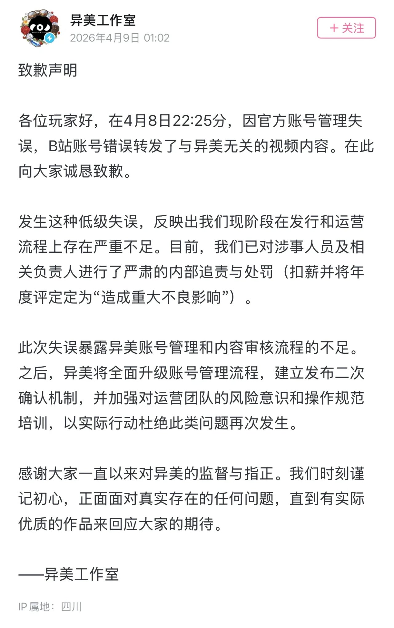各位玩家好,在4月8日22:25分,因官方賬號管理失誤,B站賬號錯誤轉發了與異美無關的視頻內容。在此向大家誠懇致歉。