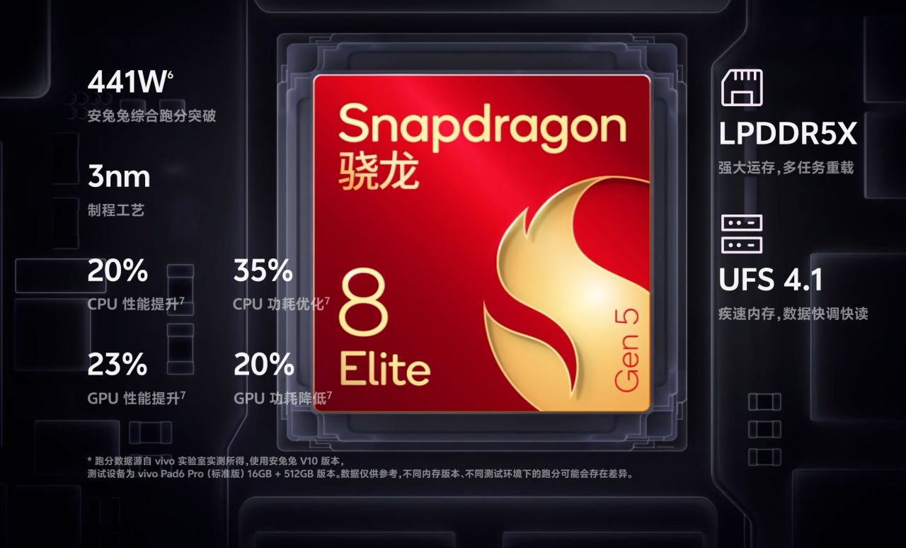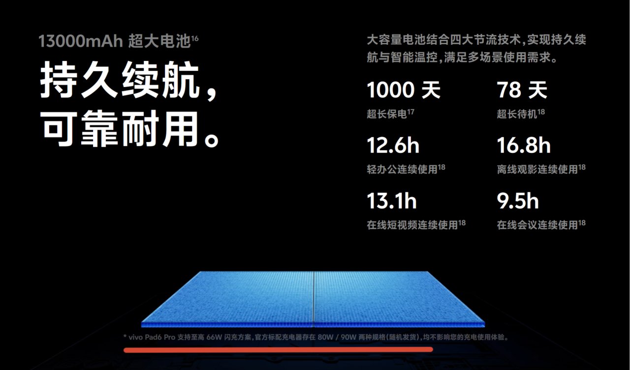 性能方面,vivo Pad6 Pro爲滿血驍龍8 Elite Gen5(第五代驍龍8至尊版)+LPDDR5X+UFS4.1三件套,續航上則採用了66W閃充+13000mAh電池的組合,傳輸接口爲5Gbps速率的USB3.2Gen1揚聲器繼續沿用上代的4低音+4中高音的分頻設計,總計8個喇叭