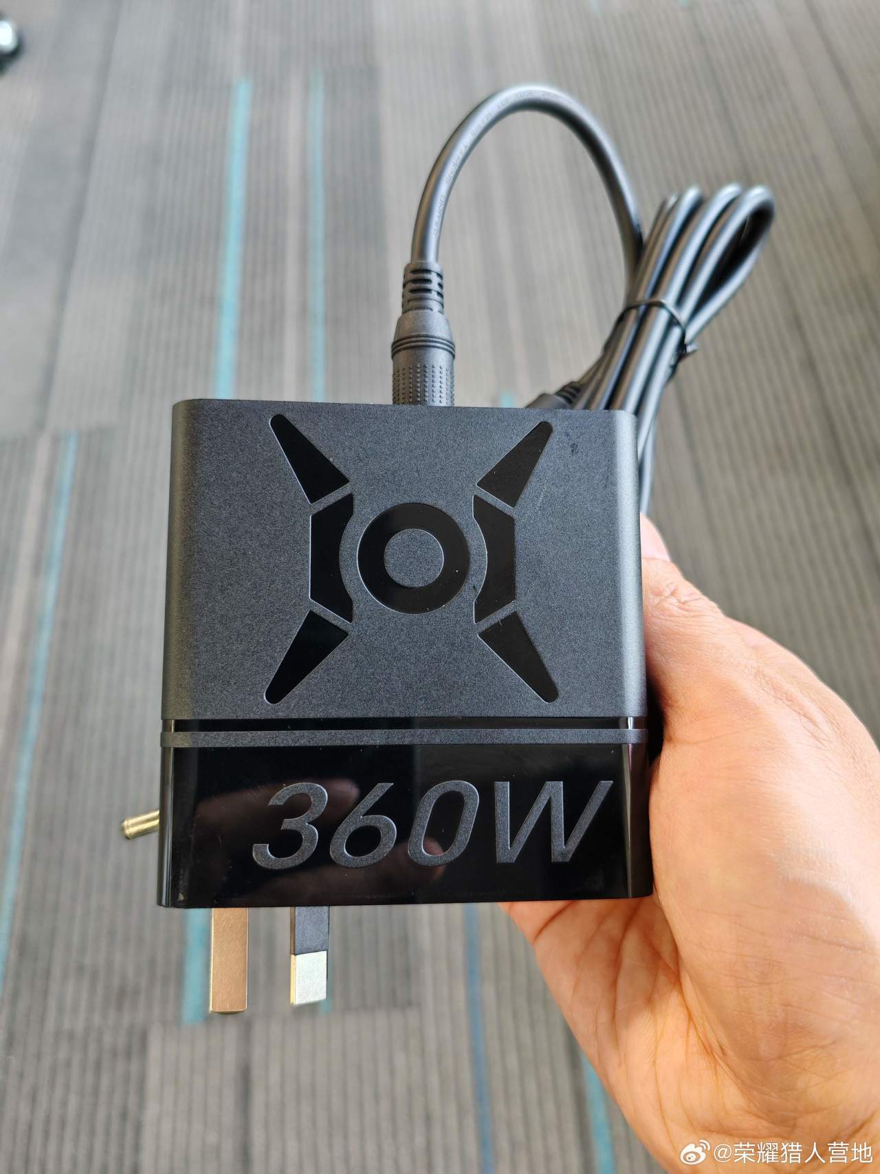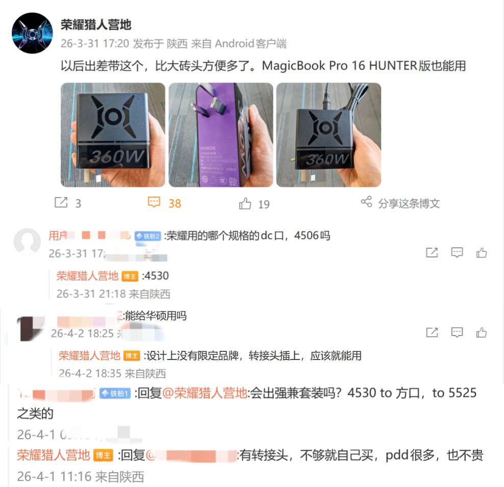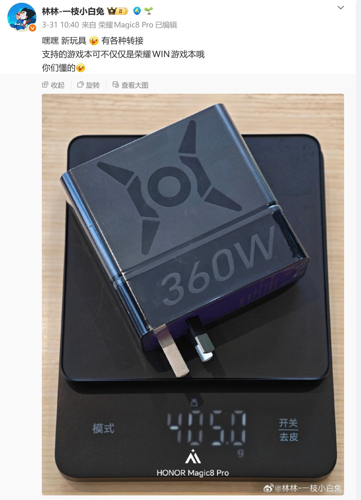 3月31日,微博“榮耀獵人營地”跟“林林–一枝小白兔”(現榮耀筆記本產品經理)曝光了一款榮耀即將發佈的便攜式360W氮化鎵筆記本充電頭,輸出規格爲20V 18A,三腳插設計,4530的DC口,支持轉接,重量約405g,預計會隨榮耀win遊戲本一起發佈。
