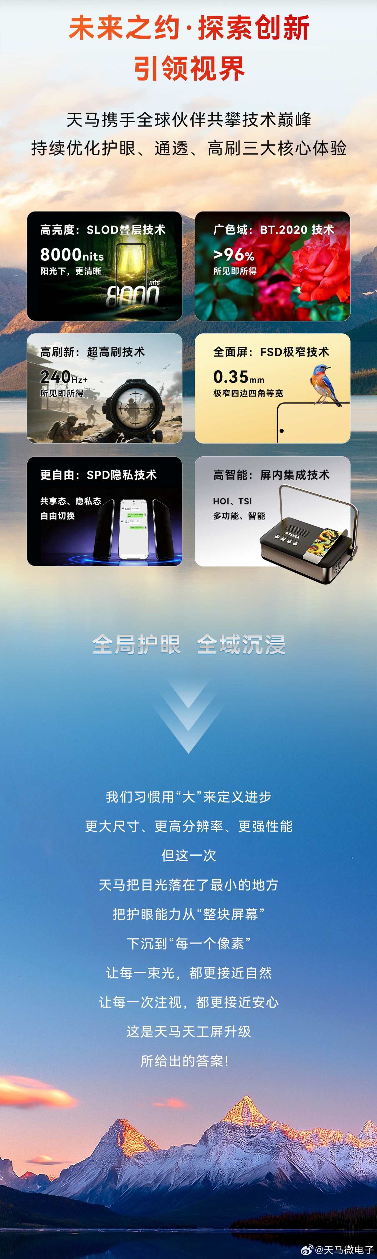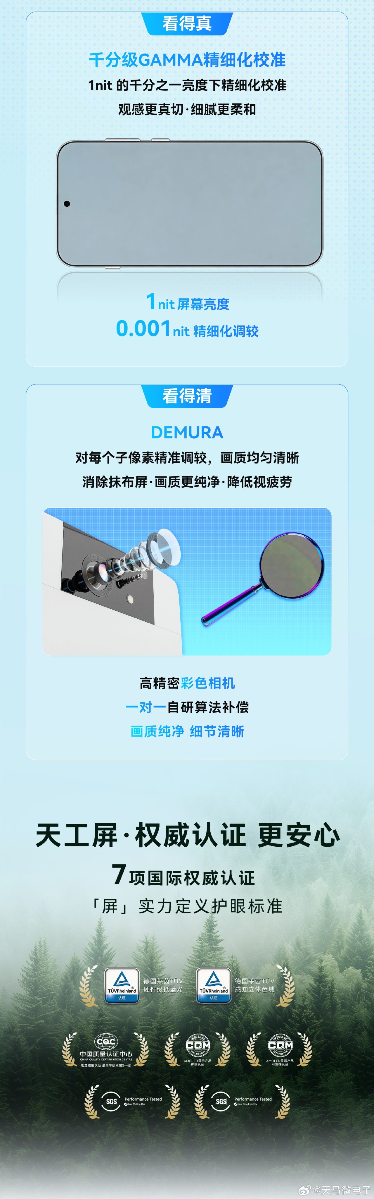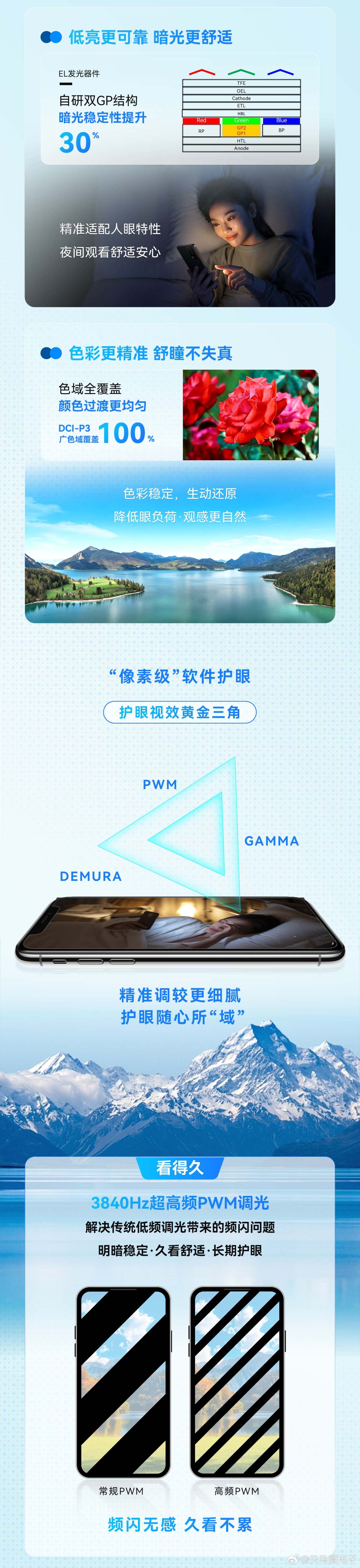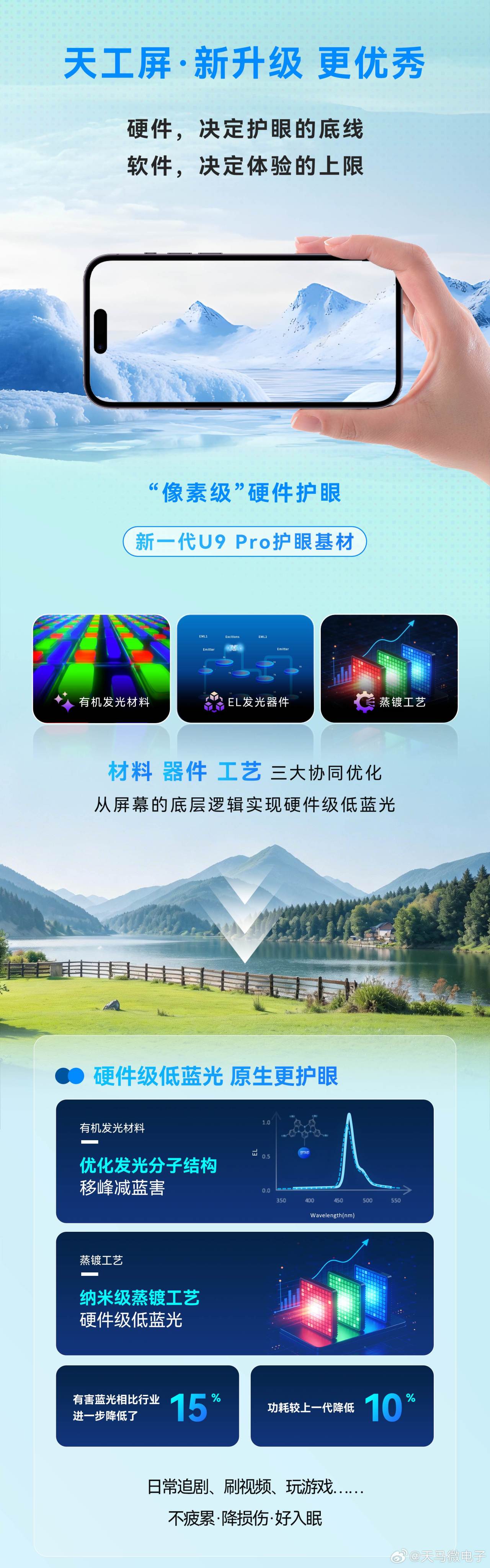 3月31日,天馬正式公佈旗下OLED手機端產線新一代U9 Pro發光基材,升級點多多,包括宣稱進一步降低15%的有害藍光,降低10%的功耗,局部峯值亮度提高到8000nits,支持SPD防窺屏隱私技術,0.35mm四邊四角等寬FSD極窄邊框技術……而其中最亮眼的莫過於240Hz+刷新率和>96% BT.2020色域覆蓋(這指標已經對標電視跟顯示器行業的RGB-MiniLED技術了),後期實機首發的時候,應該是以1.5K 240Hz的規格出現,2K 240Hz那功耗不得炸嘍