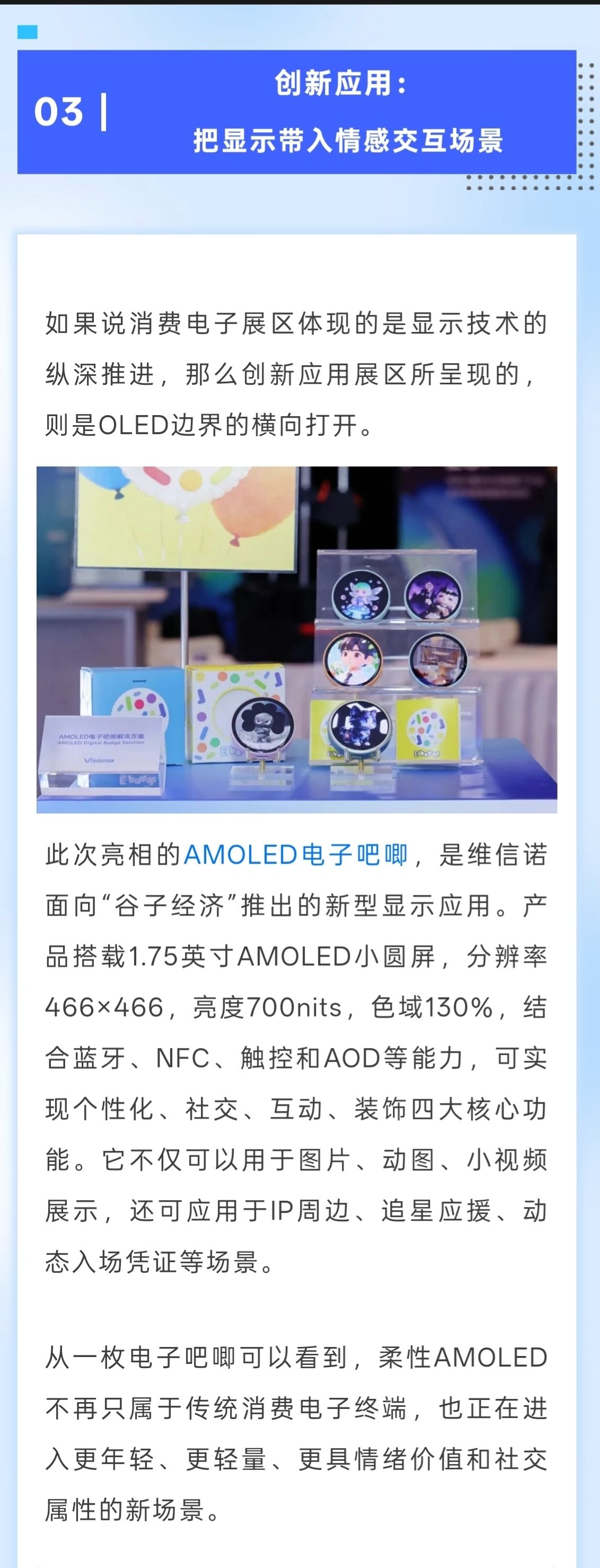 順便講點有趣的,在4月1日開始的ICDT 2026國際顯示技術大會中,維信諾展示了OLED屏幕應用新場景——電子吧唧,似乎盯上二刺螈和追星族市場