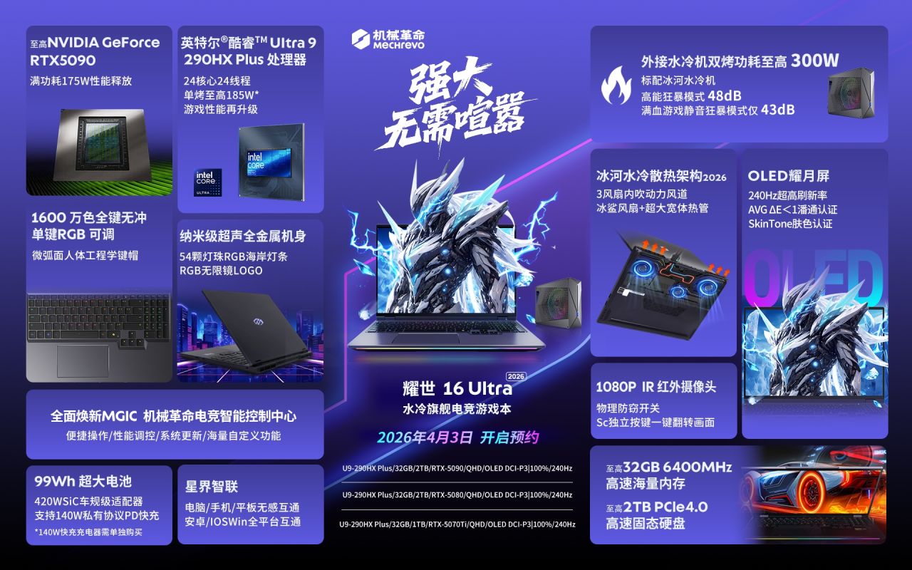 4月3日,機械革命上架了耀世16Ultra 2026,並於4月7日10點正式開售,首發共三個版本,目前配色僅有一個灰色: