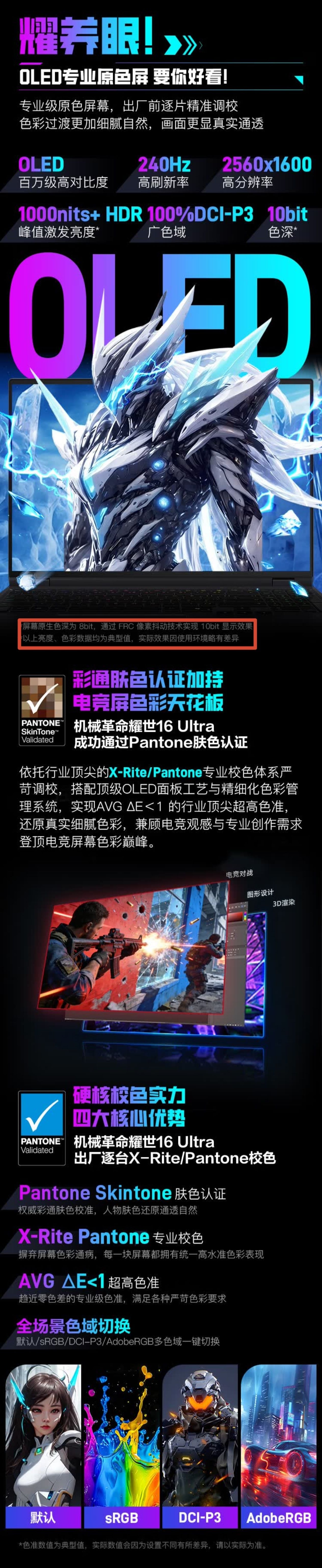 而2026款與上代最大的不同,是屏幕拋棄IPS跟Mini-LED轉向了OLED陣營,2K 240Hz,16:10比例,原生8bit色深,支持8抖10,覆蓋100% DCI–P3色域,局部峯值亮度1000nits,但在顯示器OLED行業紛紛轉向新的類RGB像素排列跟低反鏡面的趨勢下,筆記本的OLED屏依然出道即落伍而且這個240Hz刷新率有點低,限制了OLED跟顯卡性能的發揮