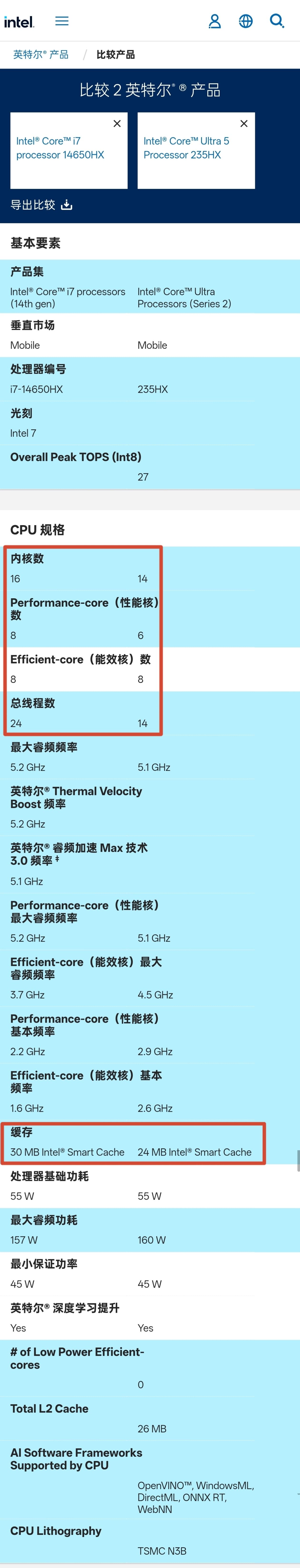 首先,處理器統一配發了Ultra5-235HX,相比上代低配的i7-14650HX在純理論性能上略有下降,Ultra5-235HX是6個大核+8個小核的設計,且爲單線程設計,總計14個線程,而14650HX是8大核+8小核設計,大核支持雙線程,總計24個線程;緩存上二者也同樣如此,14650HX是24MB二緩+30MB三緩的組合,而Ultra5-235HX則是26MB二緩+24MB三緩。