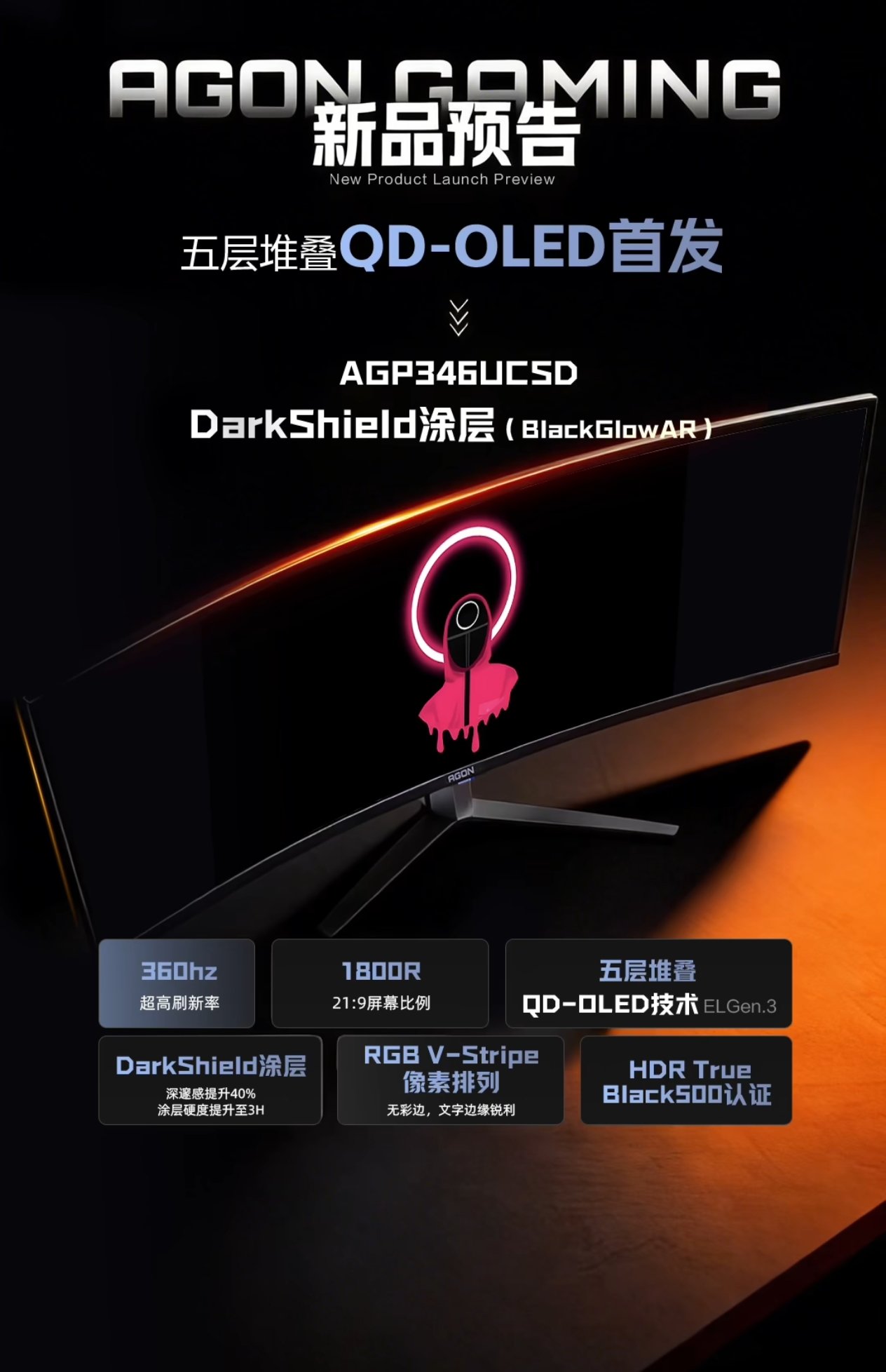 3月30日,AOC公佈了4月份即將發佈的兩款新顯示器,一款型號爲愛攻AGP346UCSD,搭載了使用全新RGB V-Stripe像素排列的三星第五代QD-OLED面板,這也是該面板繼微星 流光X36 MPG 341CQR、技嘉MO34WQC36之後的第三款產品,爲21:9比例的34英寸2K 360Hz帶魚屏,低反鏡面設計。