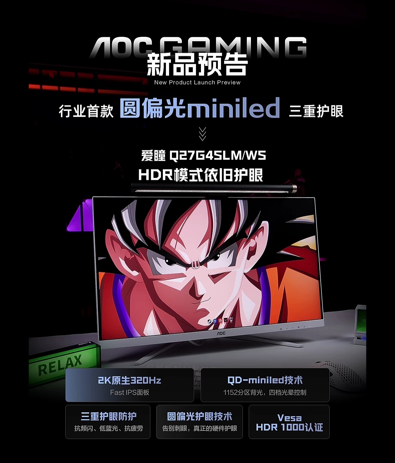 另外一款型號爲愛瞳Q27G4SLM/WS,主打行業首個圓偏光QD-MiniLED顯示器,27英寸 2K 320Hz 1152分區設計。