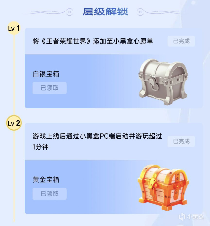 活动有两个宝箱,白银宝箱开启需要将《王者荣耀世界》添加至小黑盒心愿单,黄金宝箱开启需要通过小黑盒PC端启动并游玩《王者荣耀世界》超过1分钟