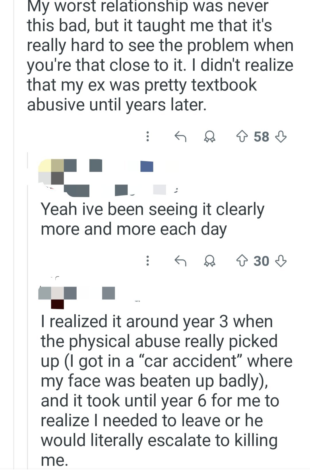 我是在第三年左右意識到的,當時身體虐待明顯升級。又過了三年,我才意識到必須離開,否則他真會把我打死。