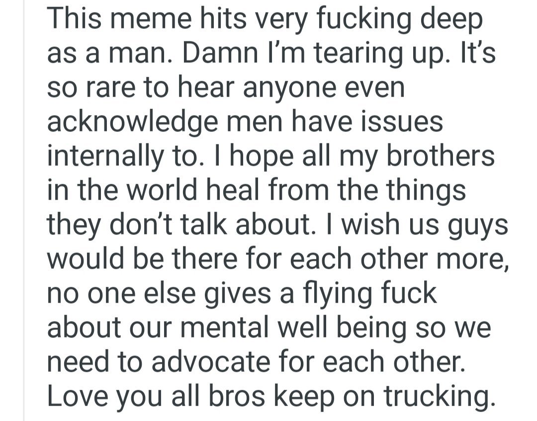 翻譯:作爲一個男人,這張梗圖真的深深刺痛了我。天哪,我眼眶都溼了。很少有人會承認男人內心也有問題。希望世界上所有的兄弟們都能從那些不願提起的傷痛中走出來。我希望我們男人能更多地爲彼此着想,因爲沒人真的在乎我們的心理健康,所以我們必須互相支持。愛你們,兄弟們,繼續前進。