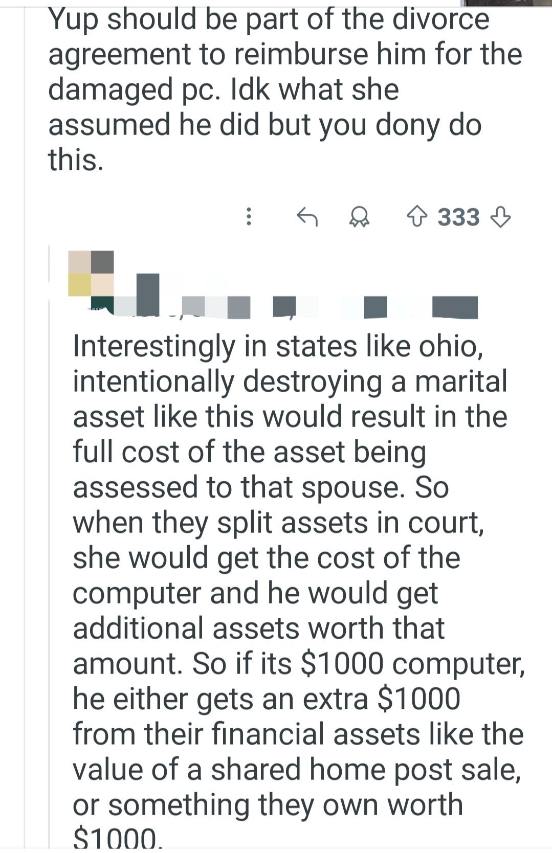 有趣的是,在俄亥俄州這樣的地方,故意毀壞婚內財產,法院會把這筆費用全額算在那個配偶頭上。所以在分割財產時,她會承擔電腦的費用,而他則會得到等值的額外資產。比如電腦值1000美元,那麼他就可以從共同財產,比如出售共有房產後的價值,或者他們擁有的某件值1000美元的東西中多拿1000美元。
