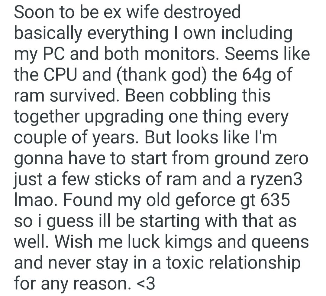 即將成爲前妻的妻子毀掉了我幾乎所有的東西,包括我的電腦和兩臺顯示器。看起來CPU和(謝天謝地)64G內存倖存了下來。我是一兩年升級一次,慢慢攢起來的。但現在看來,我不得不從零開始了,就剩下幾根內存條和一個銳龍3,唉。我還翻出了我的老GT 635顯卡,看來也只能從那個起步了。祝我好運吧,兄弟姐妹們,永遠不要因爲任何理由留在一段有毒的關係裏。