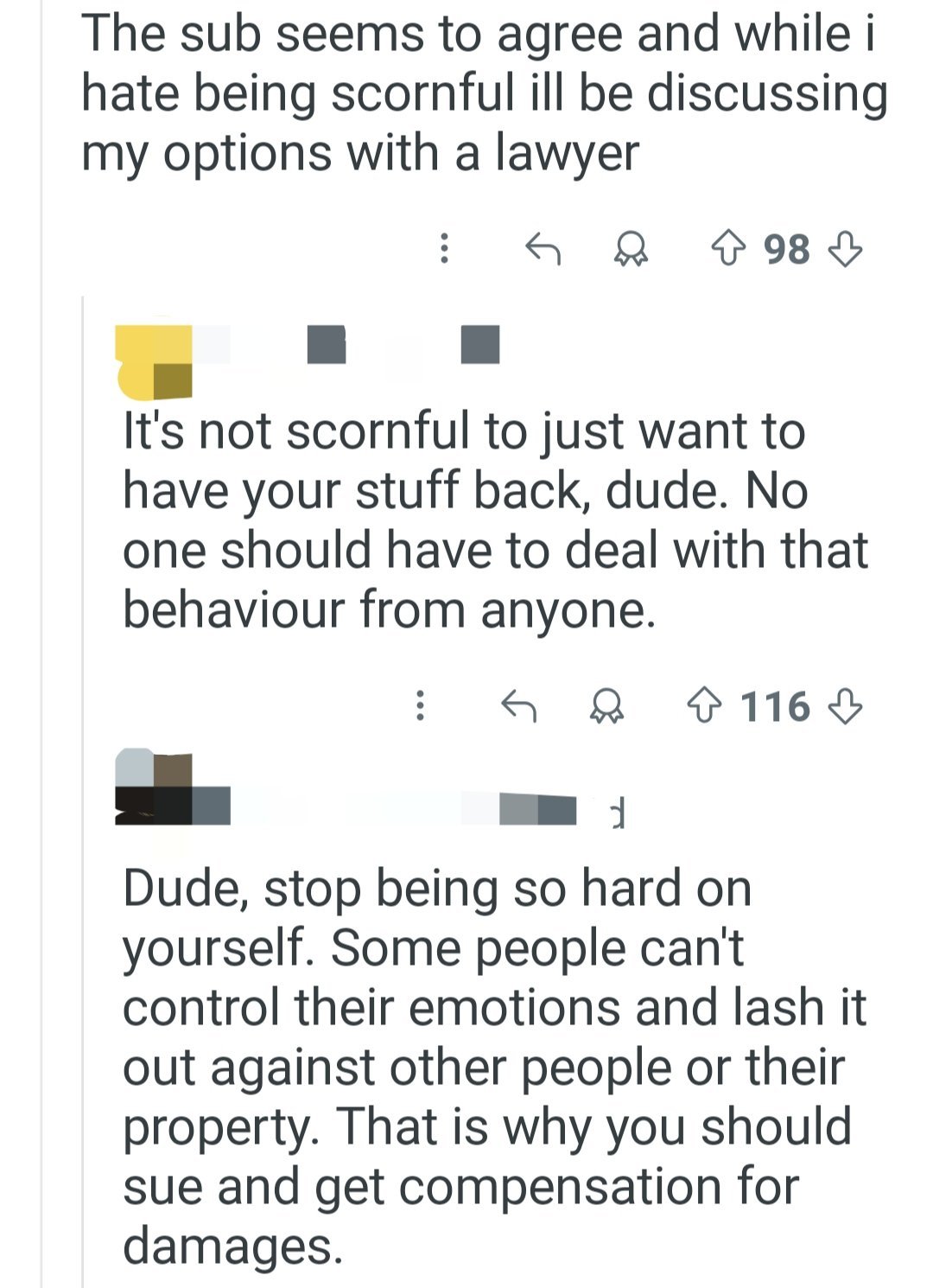 兄弟,別對自己太苛刻了。有些人就是控制不住自己的情緒,會向別人或別人的財物發泄。這就是爲什麼你應該起訴並要求賠償損失。