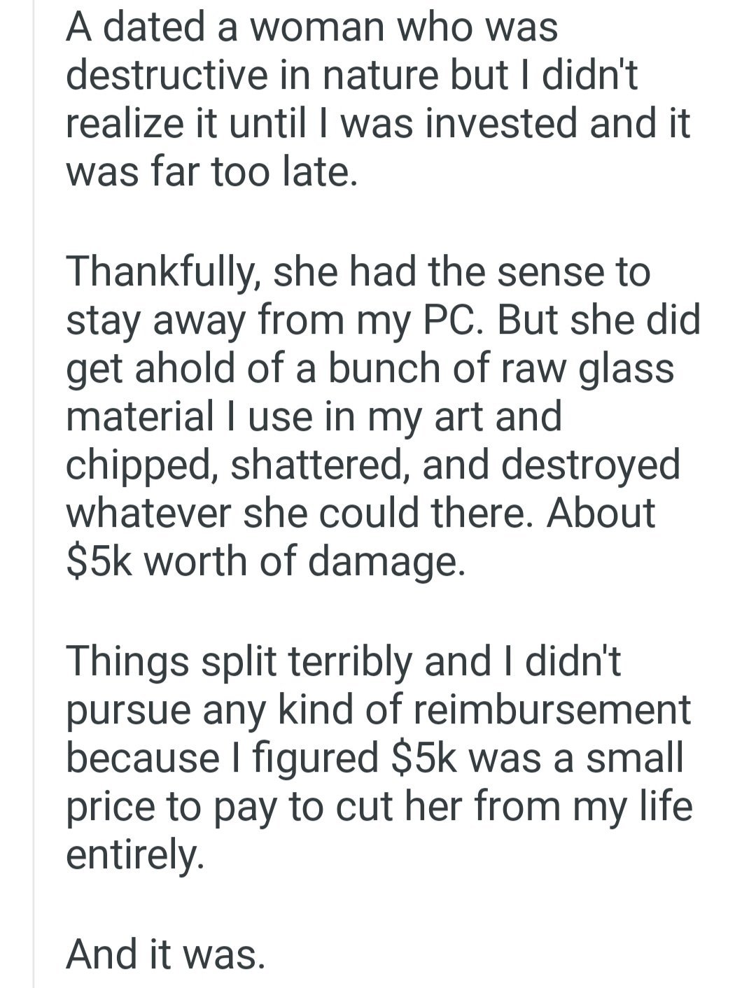 翻譯:我曾和一個破壞性極強的女人交往,但等我意識到這一點時,已經投入太多感情,爲時已晚。幸好她沒碰我的電腦。但她找到了我創作中使用的一堆玻璃原料,把能砸的全都敲碎、打爛、毀掉了。大概造成了5000美元的損失。我們最終徹底鬧翻了,我也沒去追究任何賠償,因爲我覺得花5000美元就能把她從我生命中徹底清除,代價不算大。事實也的確如此。