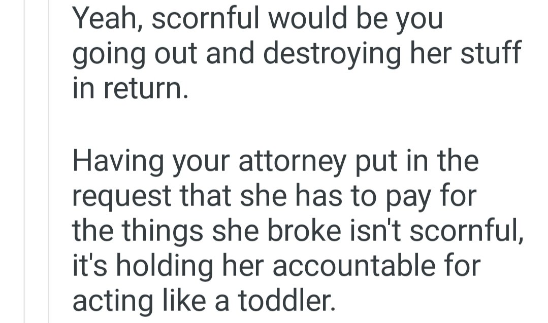 讓你的律師提出要求,讓她賠償她砸壞的東西,這不叫刻薄,這叫讓她爲自己的熊孩子行爲負責。