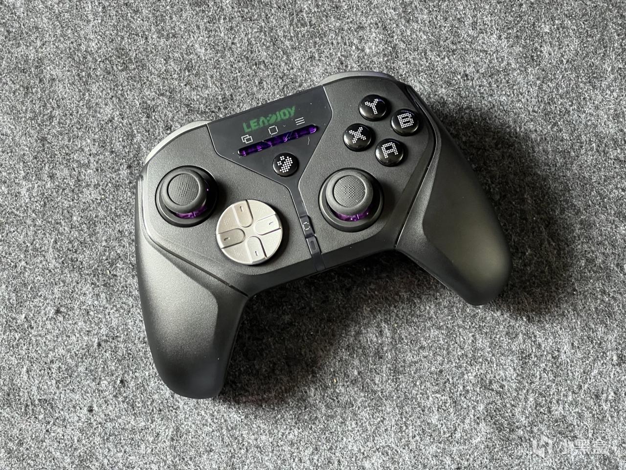 拿起手柄,外观上Leadjoy天剑Plus还是挺朴素的,正面大面积采用了晒纹处理,home键周围用雾透材质做了分隔,加上logo点阵屏的点缀,算是增添了一点层次感。