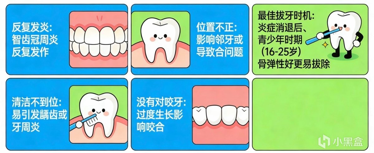 清洁不到位:智齿在最里面,刷不干净,容易蛀牙,还可能连累邻牙。