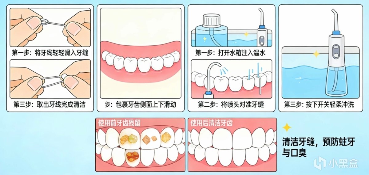 对于牙缝大、戴牙套、或者用不来传统牙线的人,冲牙器是很好的替代。高压水流冲走食物残渣和部分菌斑。但注意:冲牙器不能完全替代牙线,因为水流对黏附性强的牙菌斑清除能力有限。最好“牙线+冲牙器”搭配使用。