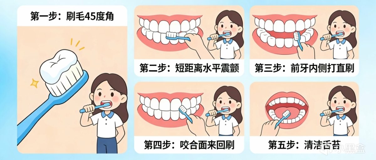 每天刷牙两次,每次2分钟,巴氏刷牙法。