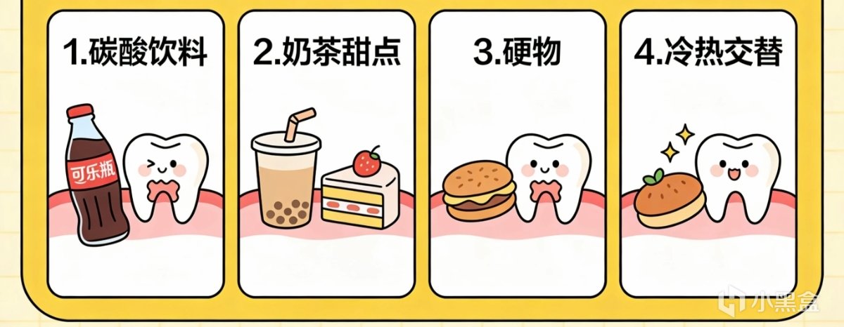 可乐、雪碧的pH值很低,会直接溶解牙釉质。长期饮用导致牙齿脱矿变色。喝的时候用吸管,让液体绕过牙齿。喝完不要立刻刷牙(酸会让牙釉质变软,立刻刷等于刷掉一层),先用清水漱口,等30分钟-1小时再刷。