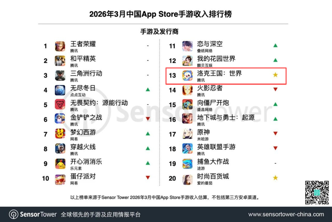 本期榜单中,腾讯《王者荣耀》《和平精英》和《三角洲行动》继续包揽TOP3;《洛克王国:世界》亮相TOP13,上线仅一周就拿下1300万美元(约人民币8900万)收入。爱的番茄《时尚百货城》收入环比激增80%,成功跻身TOP20。