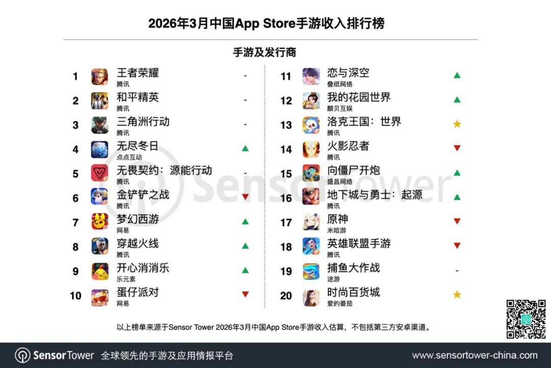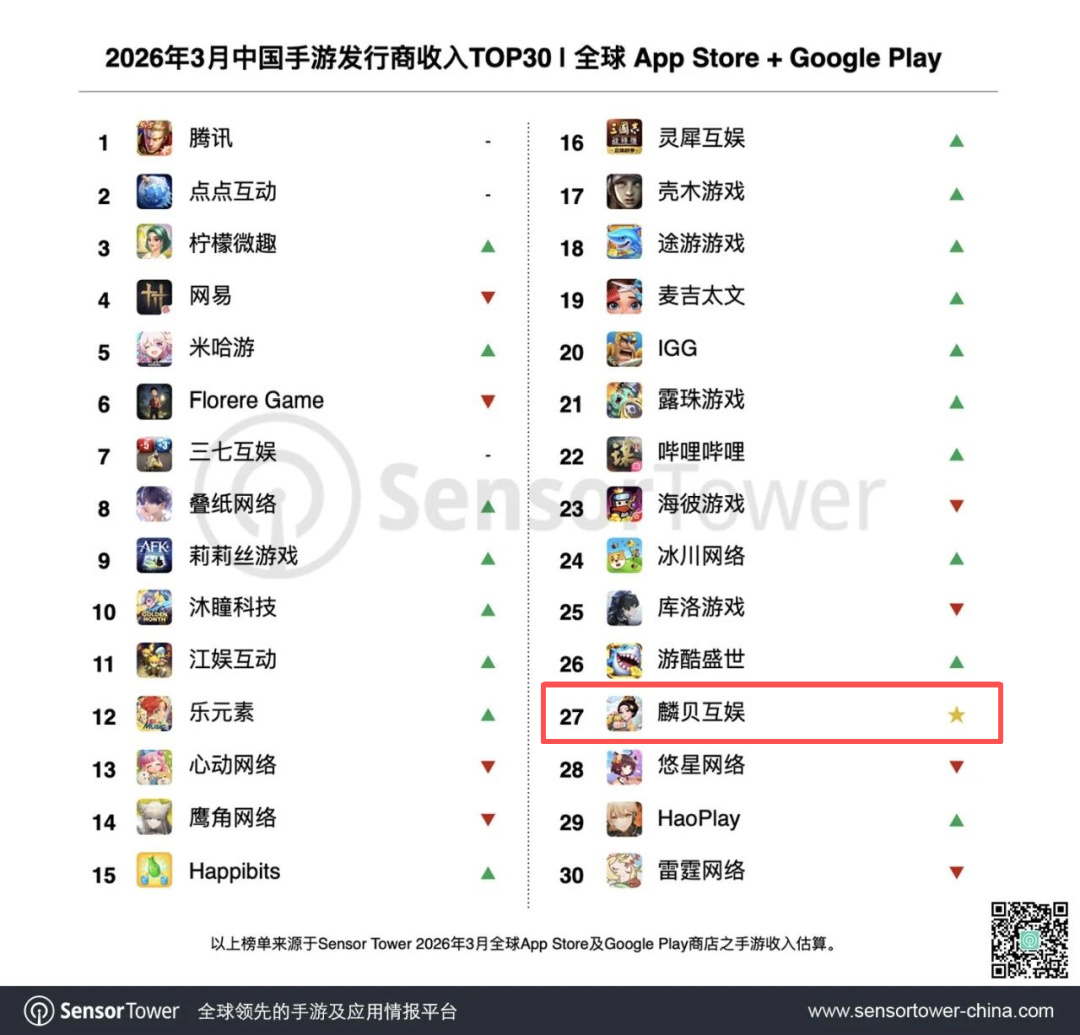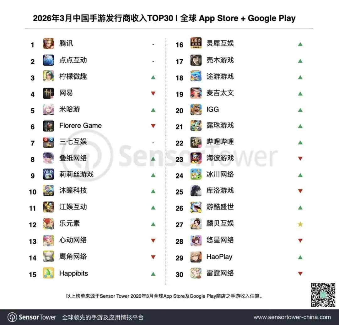 最近,Sensor Tower发布了2026年3月中国手游发行商全球收入排行的TOP30。(下文简称TOP30,仅统计发行商收入,且不包括中国地区第三方安卓渠道)