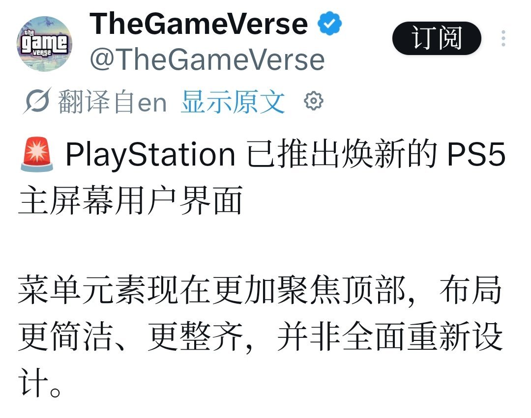索尼最近为PS5主界面推送一项小幅视觉与导航优化更新,目前已率先向部分用户开放,预计未来几个月内会逐步覆盖所有PS5/PS5 Pro用户。这个更新不是彻底重做UI,而是针对主界面布局的“清理+提速”调整,让横向滚动栏更纯粹,核心功能商店、会员、游戏库从主界面“下沉”到顶部标签页,通过手柄L1/R1键就能秒切,操作效率明显提升。