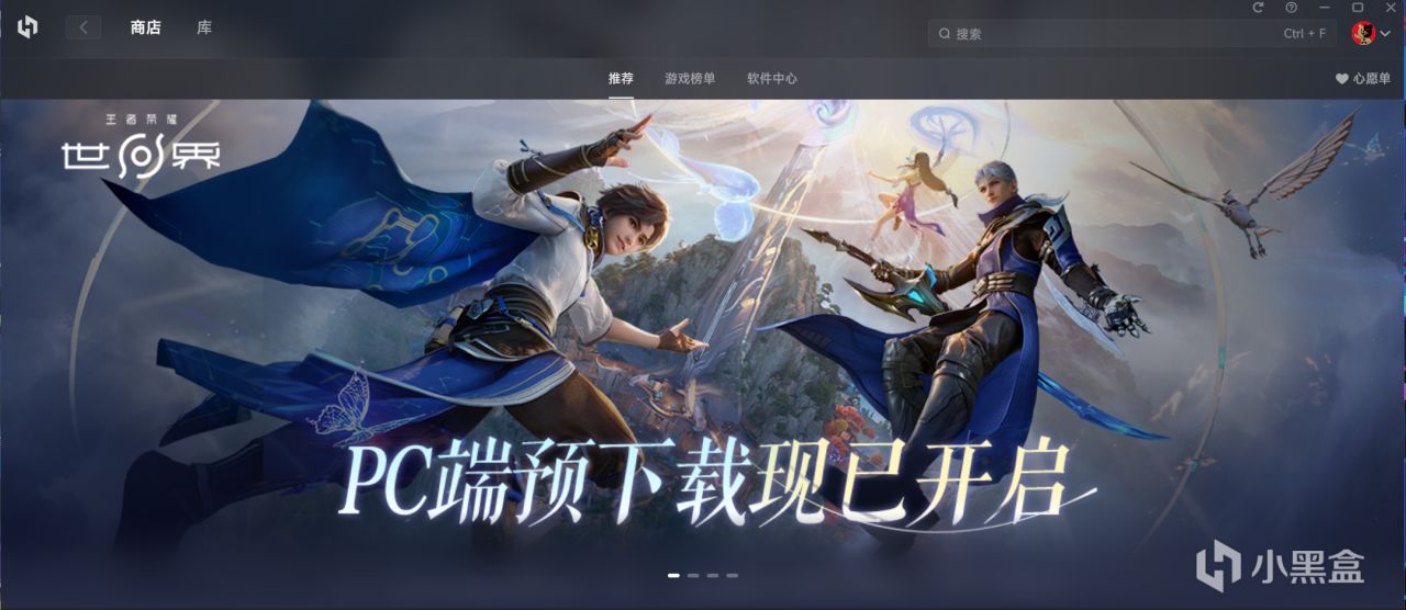 2.下載好小黑盒PC端後,在商店首頁就能看到”《王者榮耀世界》PC端預下載現已開啓”,點擊進入後就可以添加到庫,或是搜索《王者榮耀世界》添加