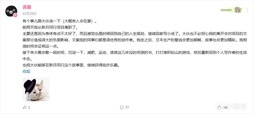2025年2月,《新月同行》主筆白伯歡離職,這對一款高度依賴劇情驅動的二游來說,是一次不小的打擊。