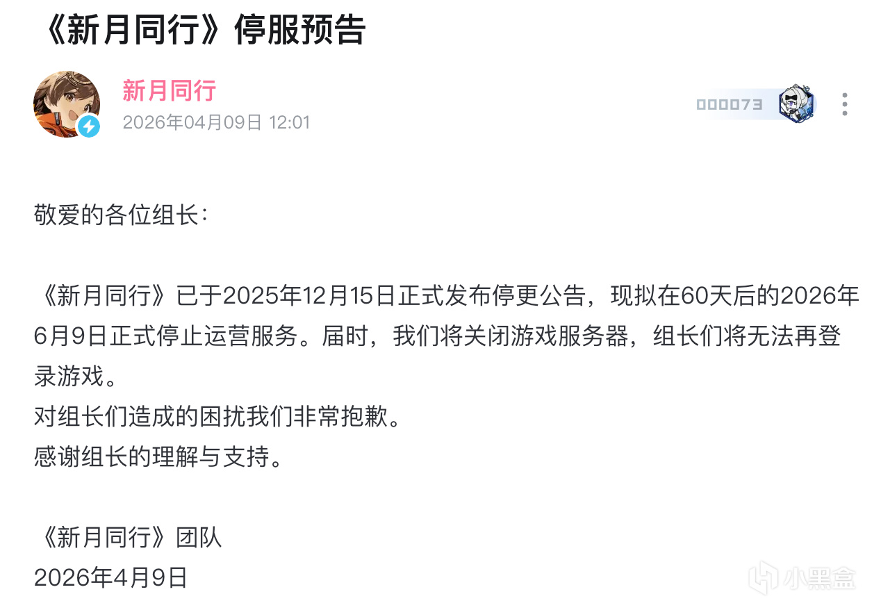 公告顯示,《新月同行》早在2025年12月15日就已停止內容更新,並同步關閉了充值、註冊及各應用商店下載入口。
