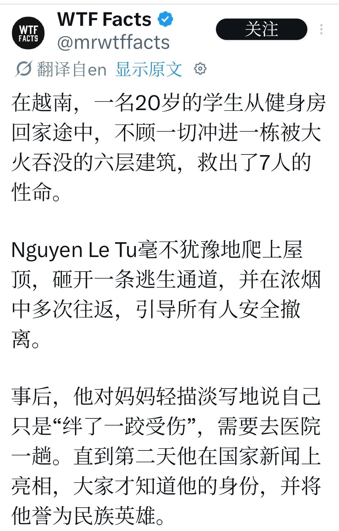 這個事件在網上迅速傳播,Tú 的故事之所以打動人,不只因爲他衝進火場,更因爲他把“捨身救人”說得極輕,把“讓家人安心”放在第一位。這種剋制、謙遜和執行力,讓人們紛紛稱讚:“英雄!”