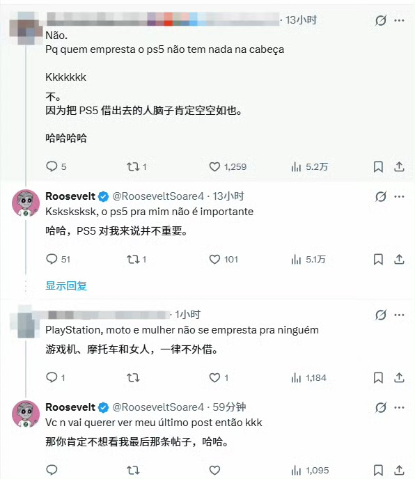 而另一边网友态度强硬,直言必须全额索赔,甚至有网友直言“敢把PS5外借本身就没长脑子”。而Roosevelt淡然回应:“PS5对我而言并不重要。”