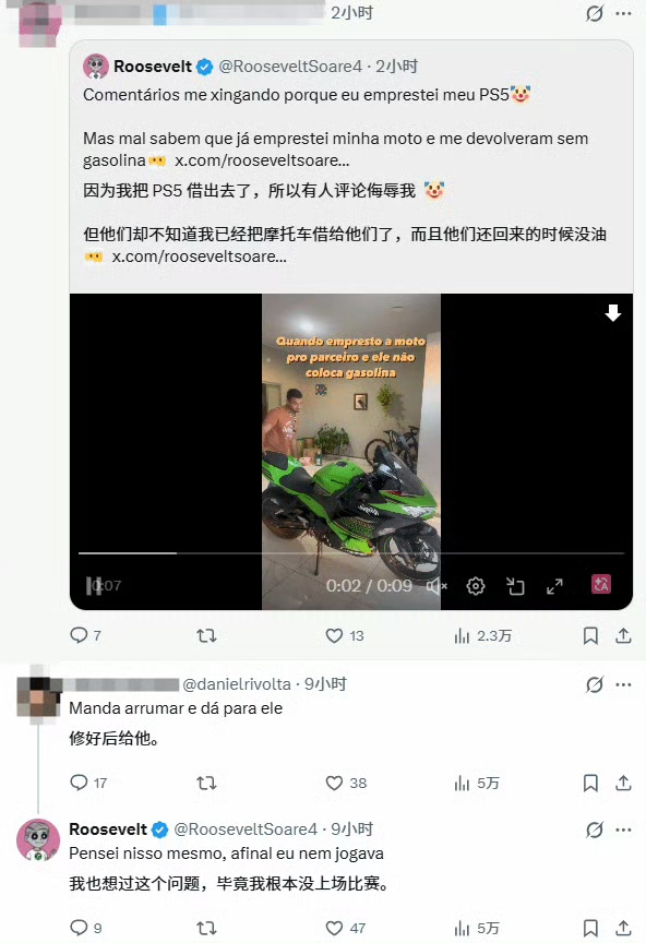 他还顺带晒出自己的“出借黑历史”:此前曾把摩托车借给朋友,归还时油箱竟空空如也。有网友调侃打趣“游戏机、摩托、爱人,三样绝不外借”,Roosevelt幽默回复:“那你可别去翻我上一条帖子了。”
