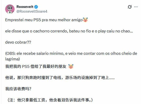 把自己的PS5主机借给了最好的兄弟,不料对方家中狗狗乱跑时撞落电源线,导致主机重重摔落,机身严重损坏。更陷入两难的是,朋友仅拿着巴西最低工资收入,事发后哭着前来致歉,这让他不知是否该要求对方赔偿。