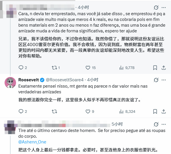 该帖子一发布网友评论两极分化。一边网友劝解:“友情远比这台价值4000雷亚尔(约合人民币5000元)的游戏机珍贵,不必索要赔偿,物品会随时间贬值,真挚的友谊却能相伴一生。”对此Roosevelt表示认同,还直言不少网友忽视了情谊的珍贵。