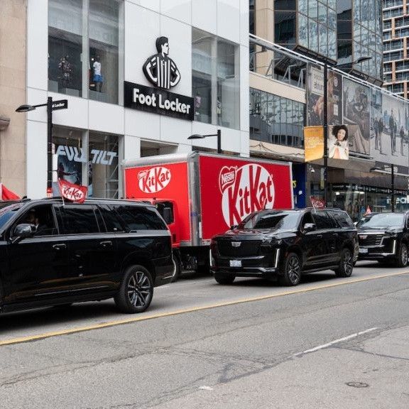 近日,加拿大有網友拍到,一輛印着KitKat巨幅logo的紅色卡車在高速上疾馳,周圍4輛純黑凱迪拉克SUV互送!