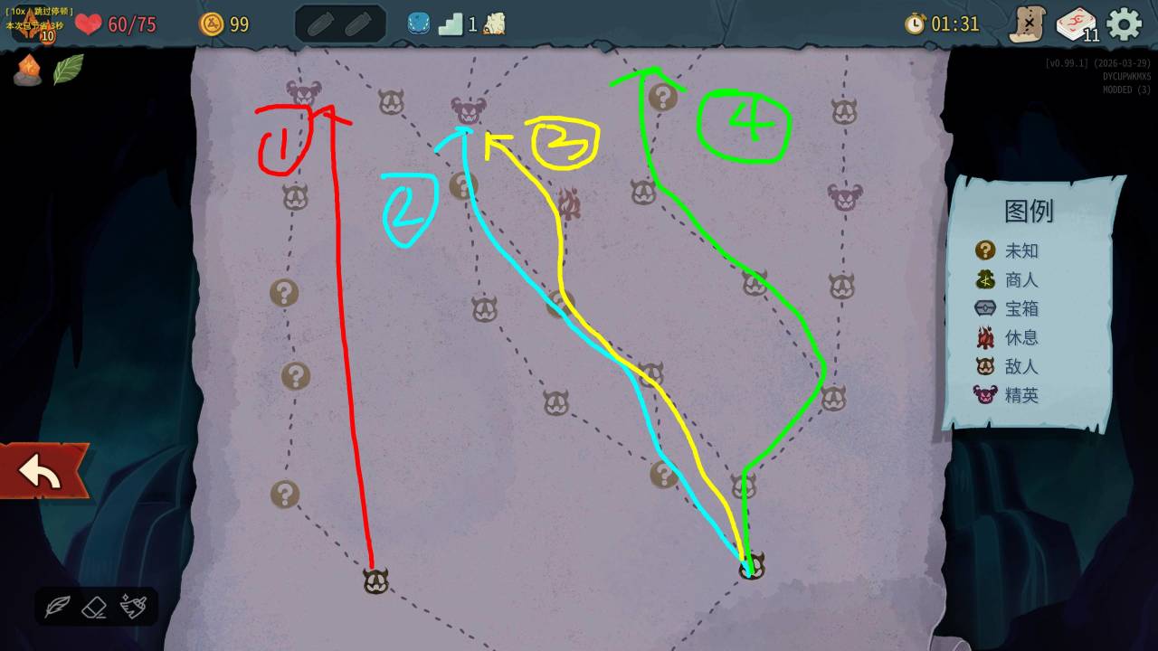 一层就还是咱们最开始讲过的,按照前面打小怪看牌、后面问号火堆逃跑,根据卡组强度决定是否冲后置精英,商店尽量后置的思路就可以。