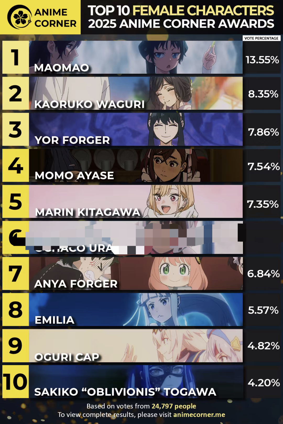 本榜单来自海外动画资讯平台 Anime Corner 举办的 2025 Anime Corner Awards 年度女性角色人气投票,投票基于该平台 24,797 名用户的自主票选,仅代表该平台活跃用户的个人喜好,不具备行业权威性,也不代表全球 / 中日动画观众的普遍审美,仅供参考。