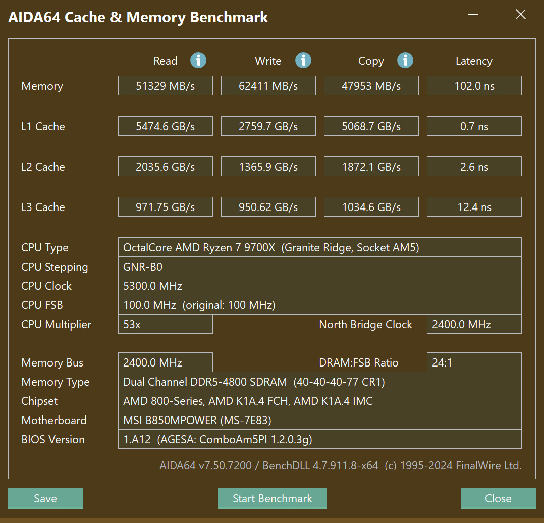 AIDA64內存測試中,讀取、寫入、複製分別約爲51.3GB/s、62.4GB/s、48.0GB/s,延遲102ns,性能符合預期,延遲偏高是DDR5 JEDEC的老問題了,和以往測試過的A-DIE顆粒內存4800MT/s狀態幾無差別。