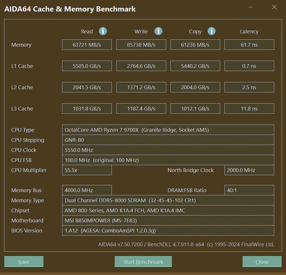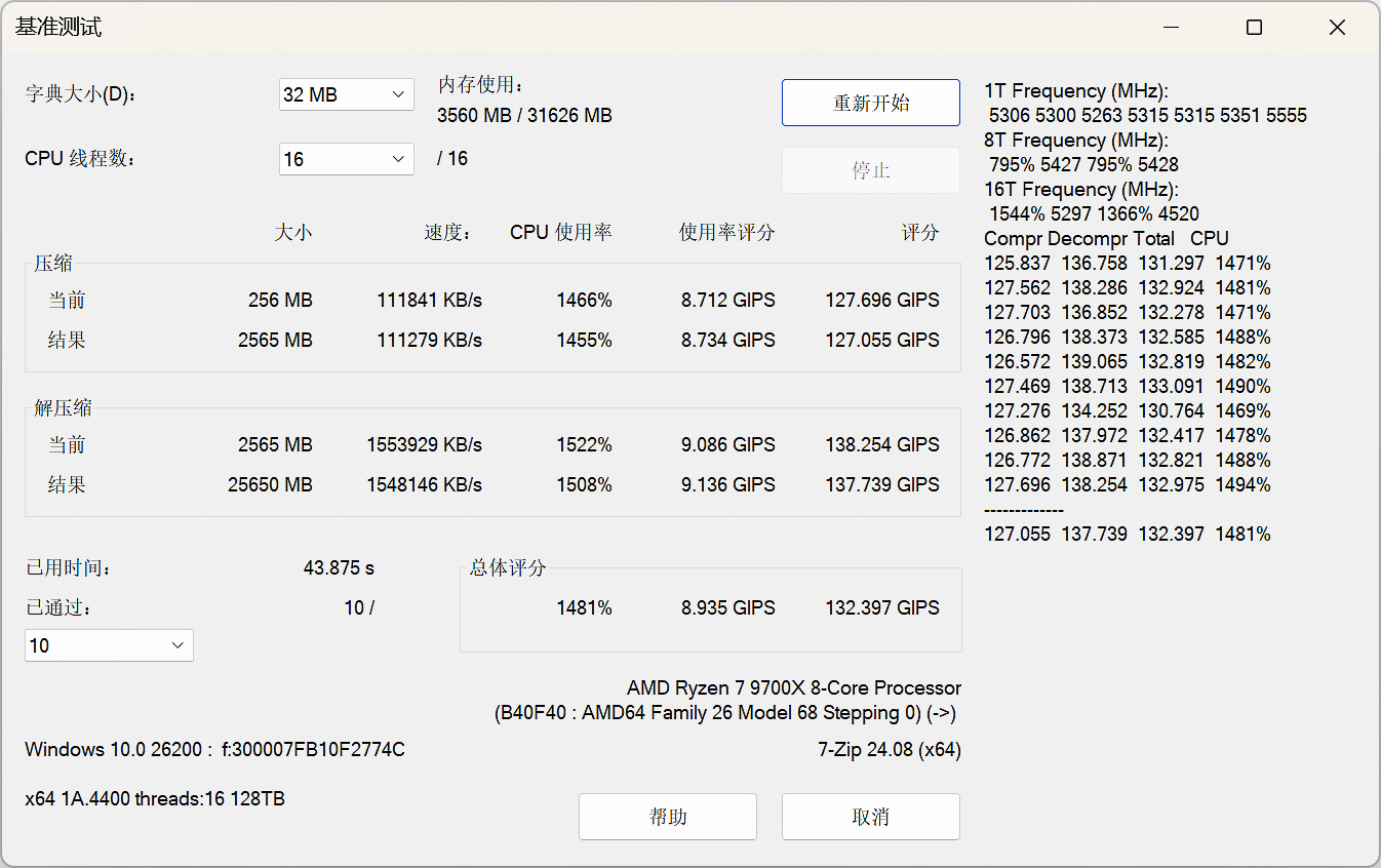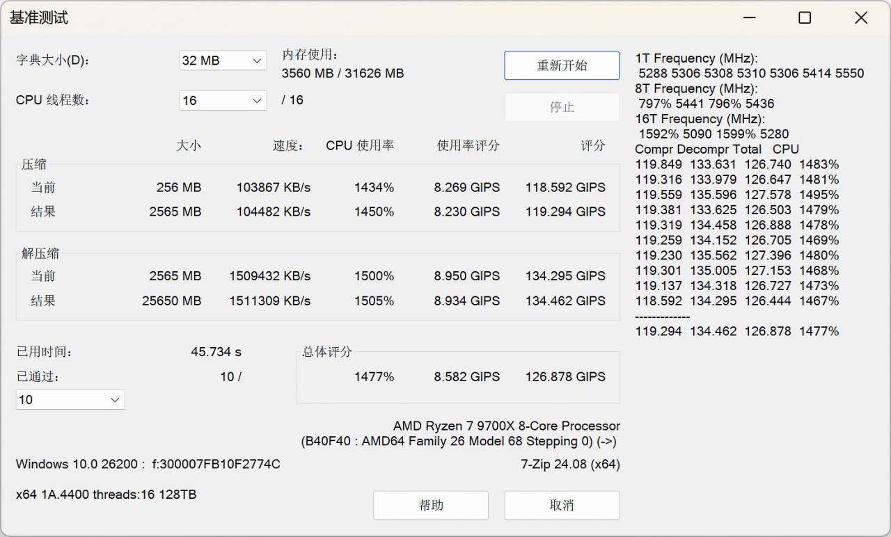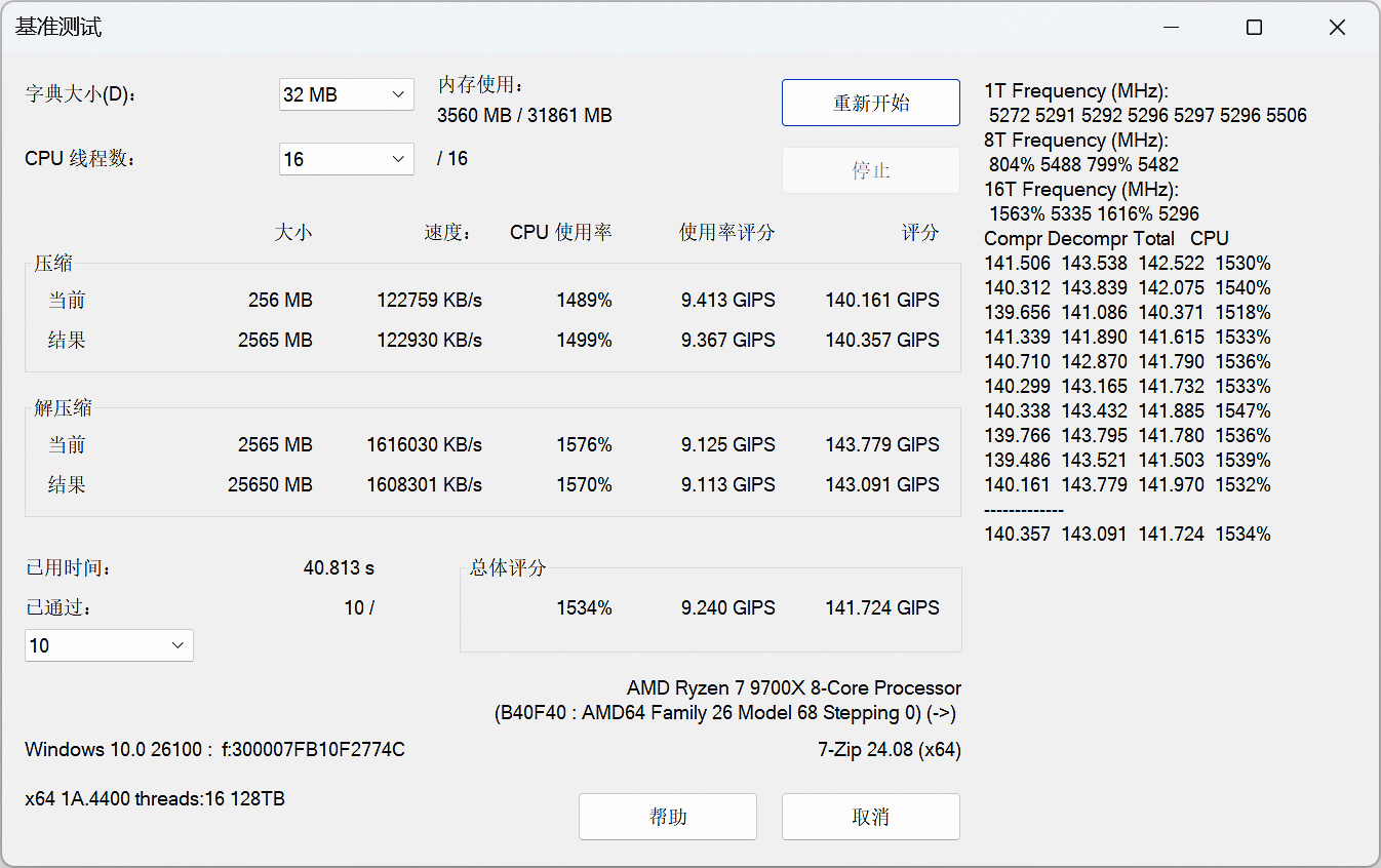 而在7-zip基準測試裏,141.724 GIPS,這應該是9700X處理器在不超頻下的極限水平了,內存頻率的提升對生產力果然還是有效果的。