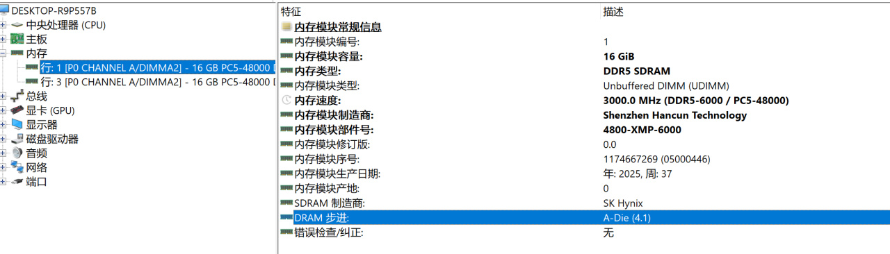 正經SK海力士A-DIE顆粒,目前DDR5高端內存裏,海力士A-DIE是第一梯隊的選手,體質好、超頻潛力大、兼容性強,是目前主流旗艦內存的標配顆粒,當然,也是最貴的。漢存玄鎧6000C28用了這個顆粒,算是給品質打了個好底子。有意思的是,HWINFO裏製造商一欄顯示的是Hancun——這個品牌信息被正確識別了,沒有未知的尷尬。