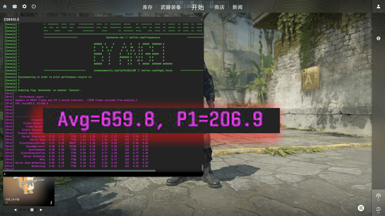 平均幀659.8,1% Low幀206.9。電競遊戲毫無壓力,輕鬆駕馭超高刷電競屏。