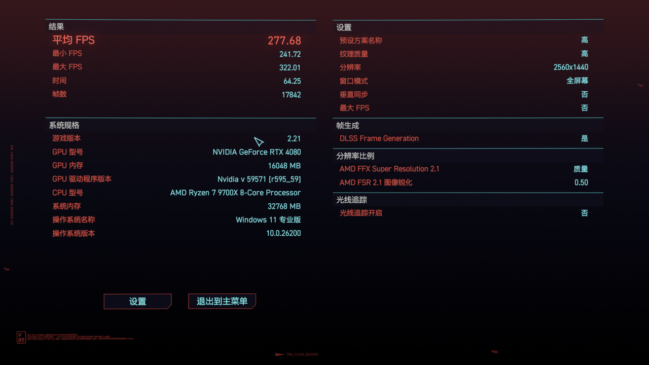 平均幀277.68,最低幀241.72。只要不開路徑追蹤,2077輕鬆拿捏。