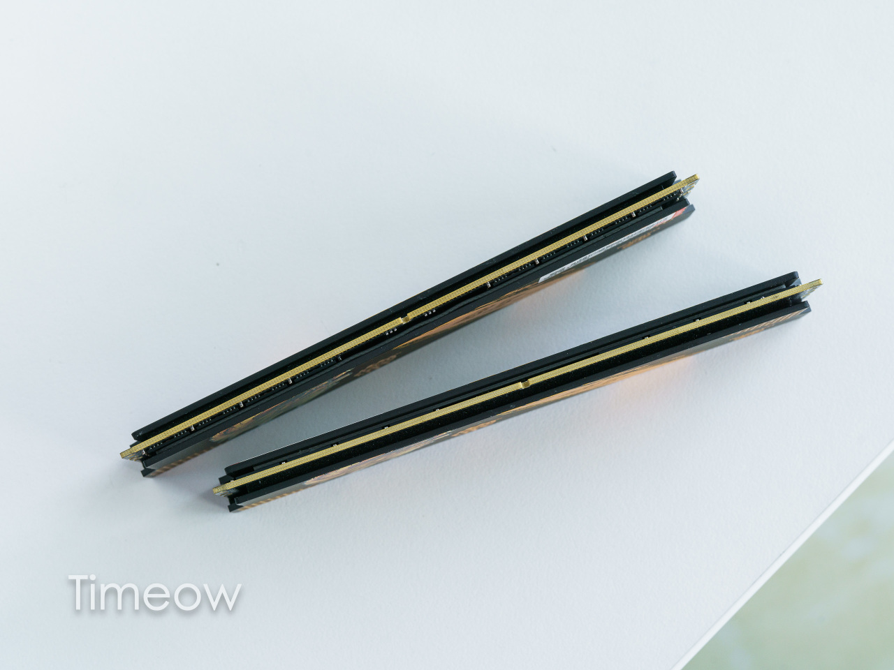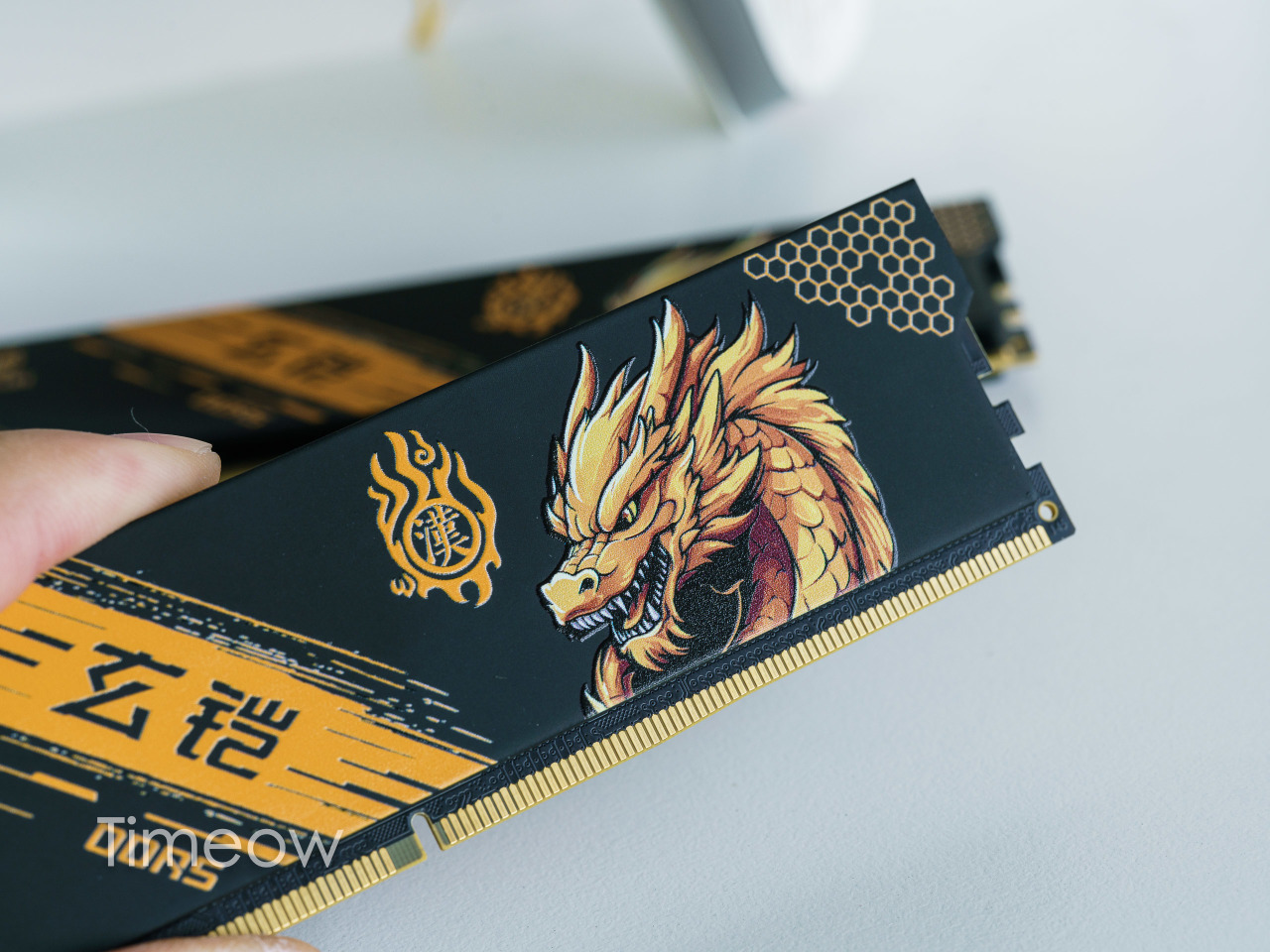玄鎧系列這個名字不是白叫的——它的散熱片採用了純黑色、2mm厚鋁合金材質,配合高密度3M散熱膠帶來了非常穩定的散熱性能。而且其表面也做了陽極氧化和磨砂處理,觸感細膩且不沾指紋。這個細節我非常在意,有些內存的散熱片用兩天就成指紋收集器,玄鎧這塊做得不錯。