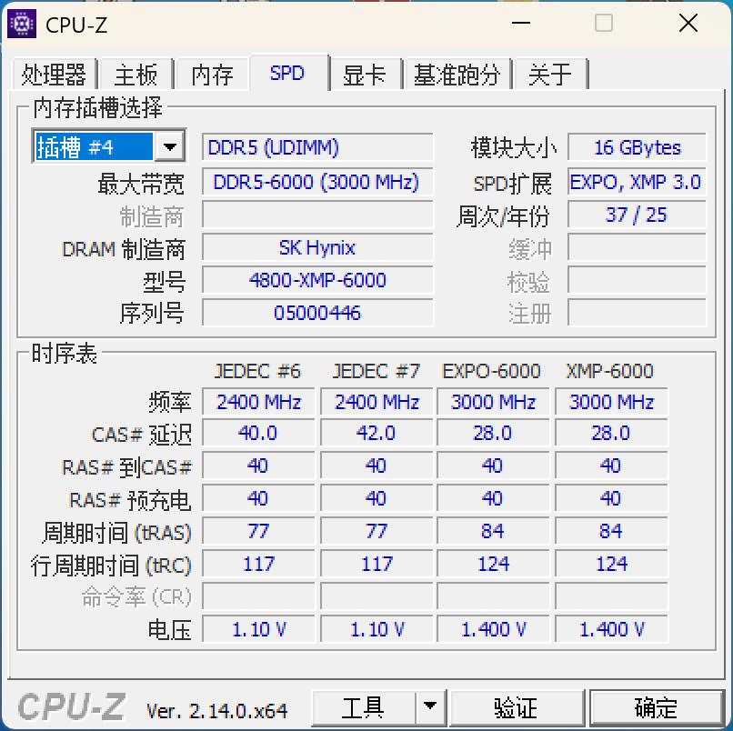 它支持XMP 3.0和EXPO雙協議,標稱頻率6000MT/s,時序CL28-40-40-84。電壓1.4V,比較寬鬆。