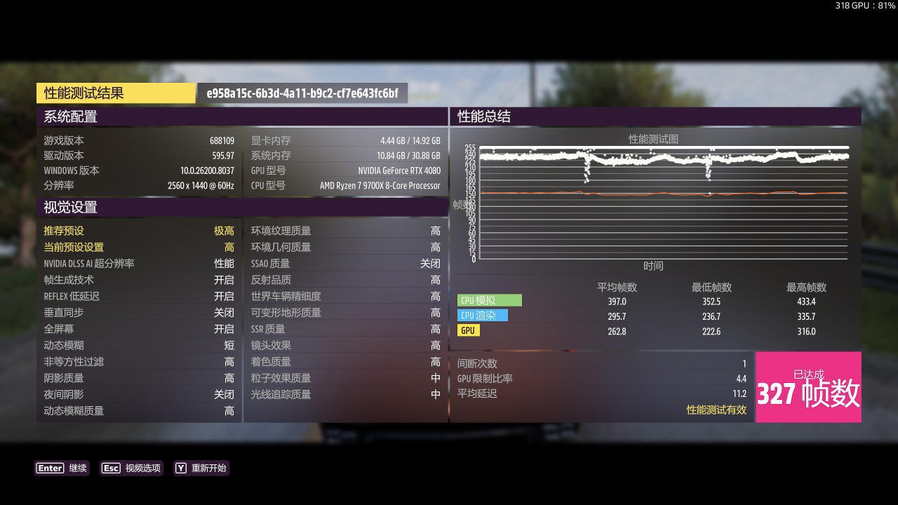 《極限競速地平線5》在同等畫質設置下,CPU平均幀397、最低幀352.5,提升也達到了20%以上。不過由於受顯卡性能限制,在顯示器上呈現的結果並沒有那麼高。