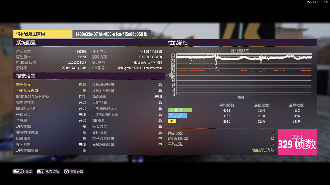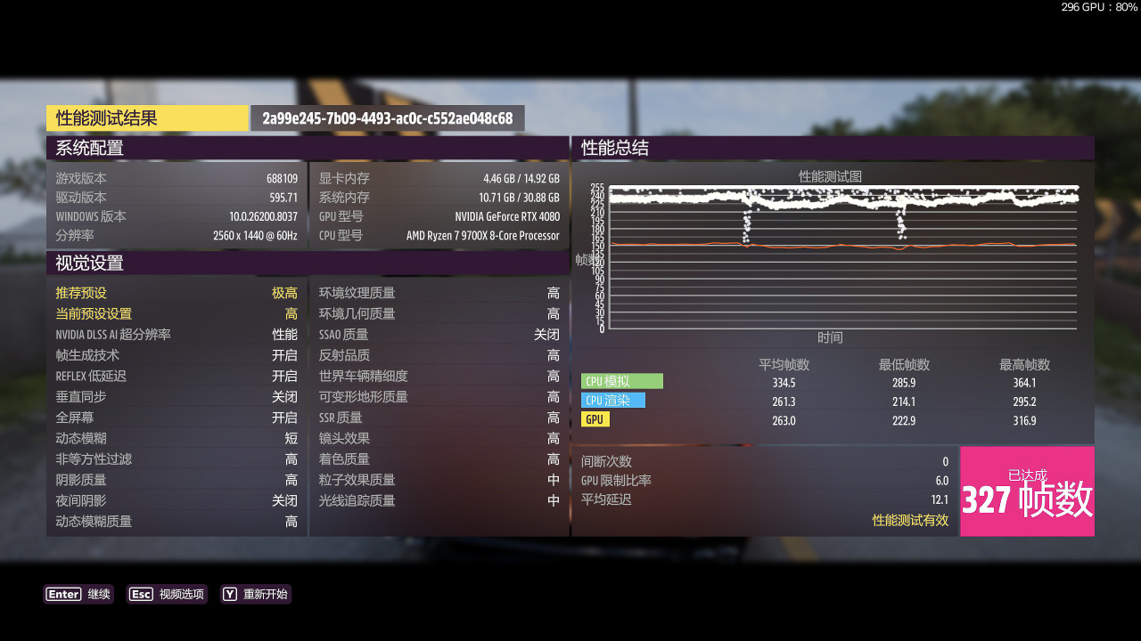 CPU平均幀數334.5,最低幀285.9。玩賽車遊戲,高刷顯示器輕鬆喫滿。