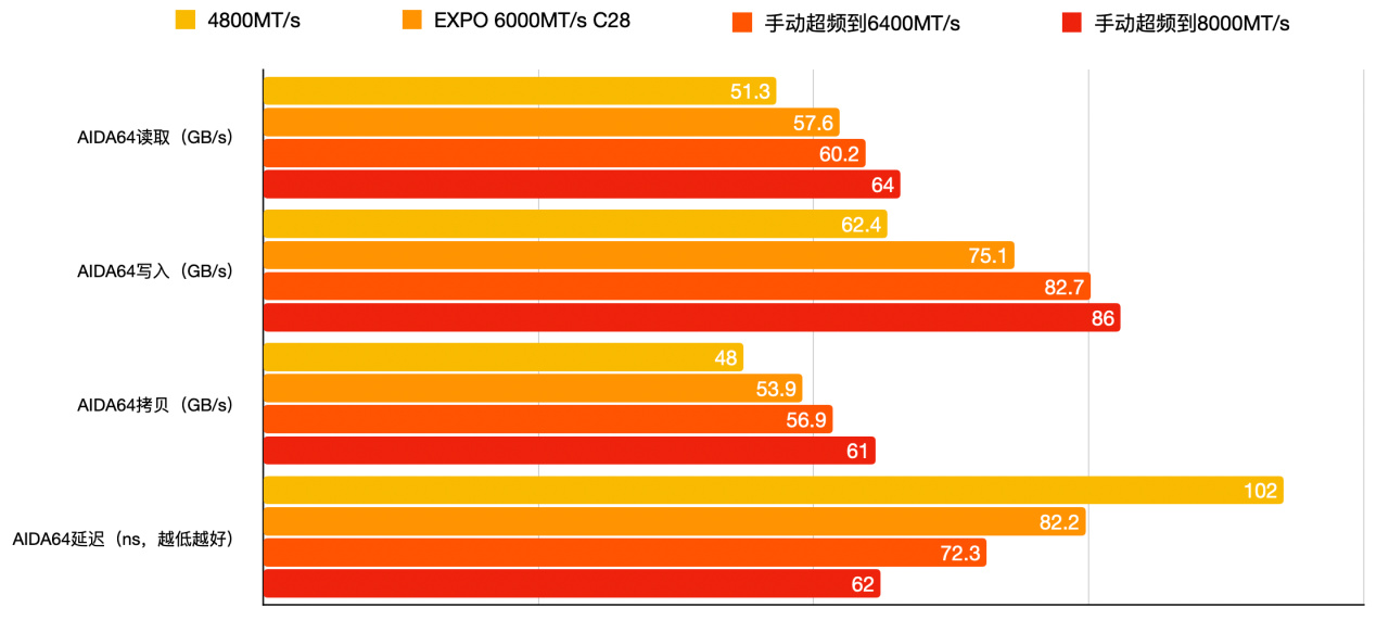 手動超頻至同步6400MT/s時,遊戲性能最穩;而手動超頻至8000MT/s時,延遲更低,生產力性能略提升一些。