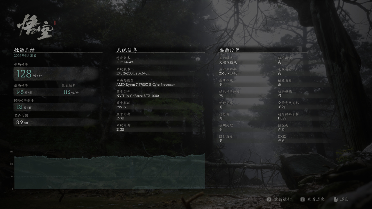 而同樣對內存頻率不敏感的《黑神話:悟空》中,平均幀128、最低幀116,提升了1幀和2幀。