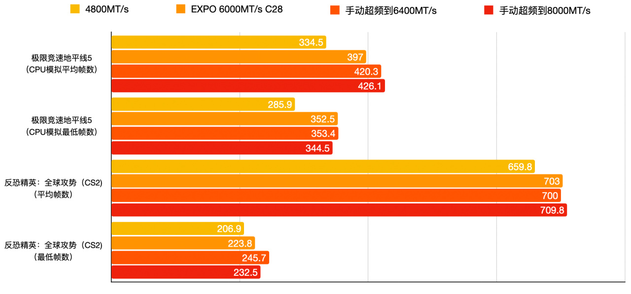 在8000MT/s頻率下,《反恐精英2》的平均幀709.8,提升了9幀;但1%low幀232.5,介於6000MT/s和6400MT/s之間。
