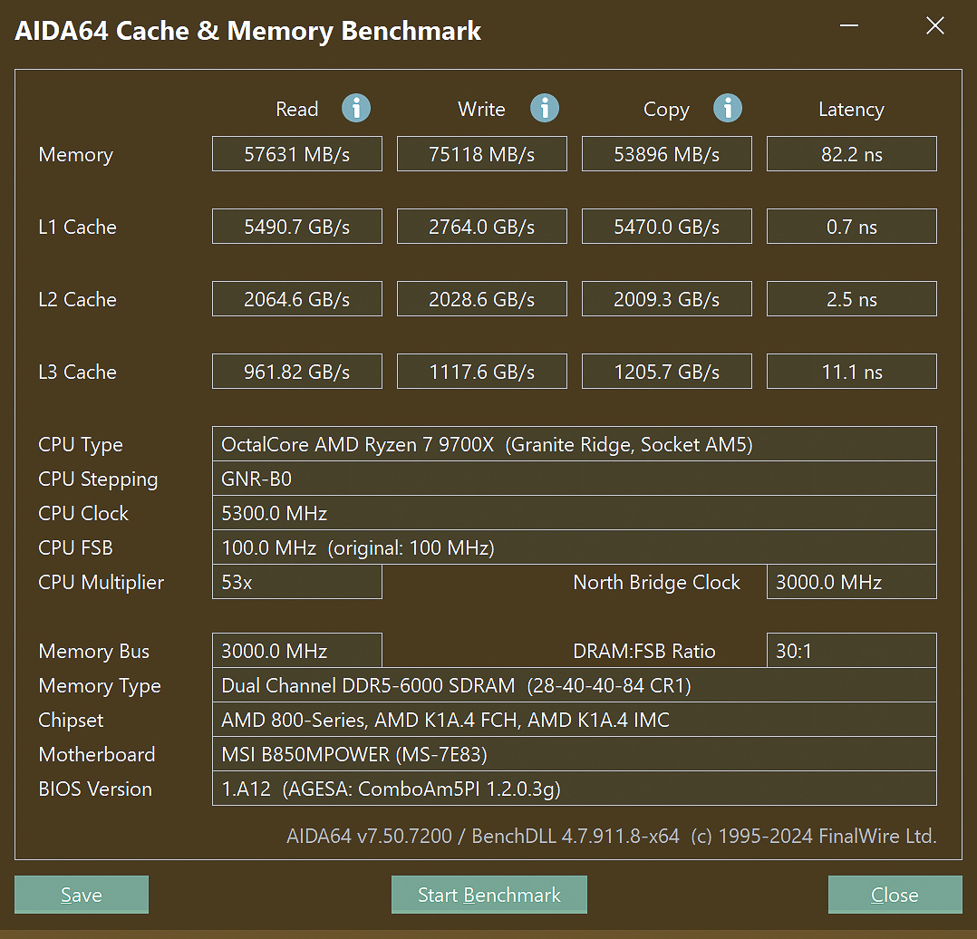 AIDA64內存測試中,讀取、寫入、複製分別約爲60.2GB/s、82.7GB/s、56.9GB/s,延遲72.3ns,性能相比EXPO自動超頻進一步提升了5~9%,而延遲進一步降低了12,接着看: